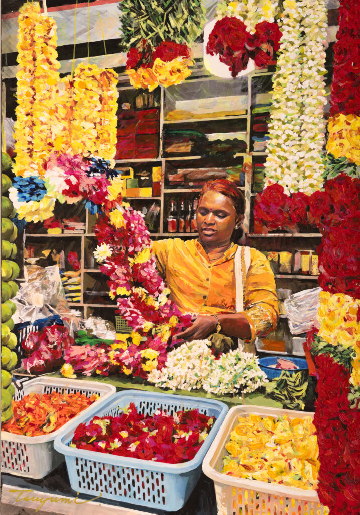 The woman depicted in Tsuyumi Miwa’s painting, Ponna, has been weaving floral garlands in Little India for more than thirty years. Before dawn, she visits the market to choose the freshest, most fragrant blossoms. With quiet focus, she threads each petal by hand—her gestures slow, deliberate, almost meditative.